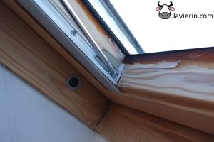Ahora toca un trabajo que es un poco cansino e incómodo, atornillar las guías a la ventana velux. De nuevo no coincidían los agujeros de las nuevas guías con los que había previamente, así que toca hacer un poco de fuerza extra para abrir camino a los tornillos por la madera.